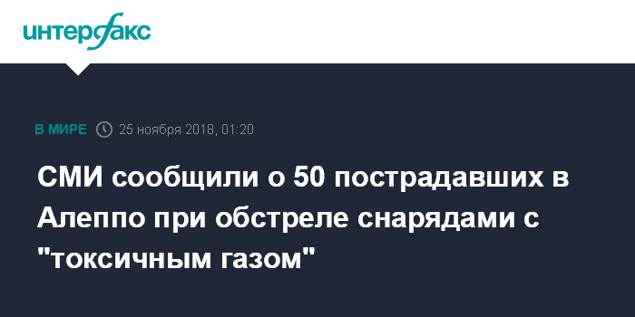 Москва. 25 ноября. INTERFAX.RU - 50 человек пострадали в результате обстрела сирийского Алеппо снарядами с "токсичным газом", сообщает в субботу агентство SANA.