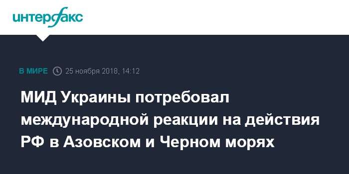 Москва. 25 ноября. INTERFAX.RU - В Министерстве иностранных дел Украины расценивают действия РФ в Черном и Азовском морях как нарушение норм Устава ООН и Конвенции ООН по морскому праву, и намерены предпринимать ответные дипломатические и международно-правовые меры.