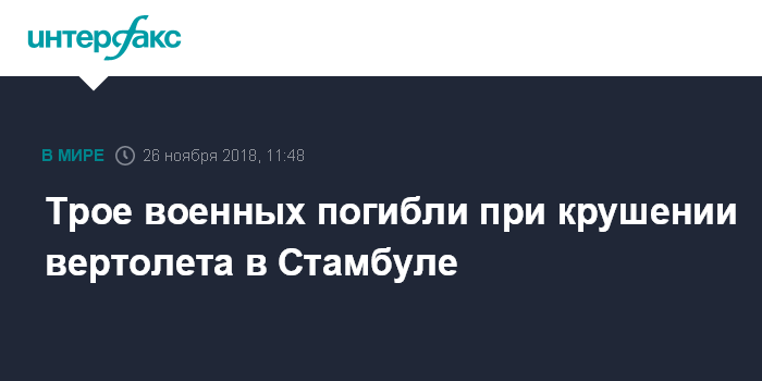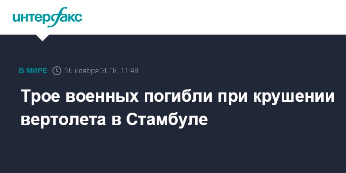 Москва. 26 ноября. INTERFAX.RU - Три турецких военнослужащих погибли в понедельник в результате крушения военного вертолета в Стамбуле, сообщает сайт издания Daily Sabah.