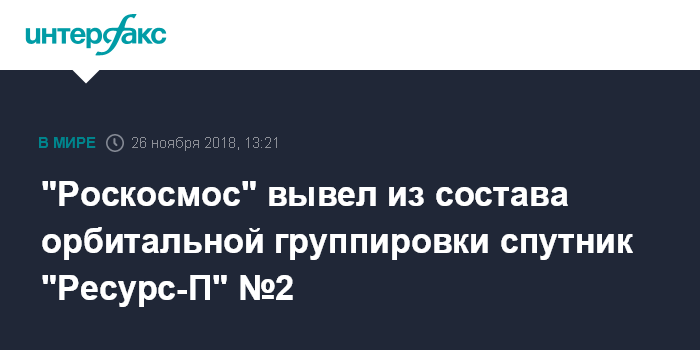 Москва. 26 ноября. INTERFAX.RU - "Роскосмос" вывел из состава российской орбитальной группировки спутник дистанционного зондирования Земли "Ресурс-П" №"2, сообщили "Интерфаксу" в "Роскосмосе".