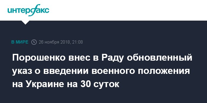 Москва. 26 ноября. INTERFAX.RU - Президент Украины Петр Порошенко внес в Верховную Раду обновленный указ о введении военного положения в стране на 30 суток, сообщил секретарь Совета национальной безопасности и обороны Александр Турчинов.