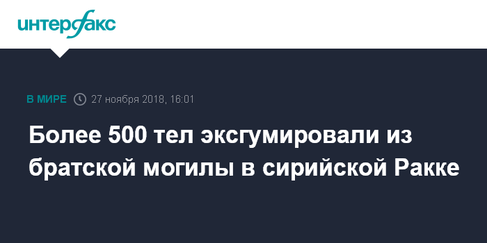 Москва. 27 ноября. INTERFAX.RU - Более 500 тел эксгумированы из братской могилы в сирийском городе Ракка, который когда-то считался так называемой "столицей" террористической группировки ИГ (запрещена в России - ИФ), сообщает во вторник агентство Associated Press.