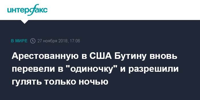 Москва. 27 ноября. INTERFAX.RU - Обвиняемая в незаконной деятельности в качестве иностранного агента на территории США россиянка Мария Бутина вновь переведена в одиночную камеру, сообщил "Интерфаксу" во вторник вице-президент Российского подразделения Международного Комитета защиты прав человека при ООН Иван Мельников.
