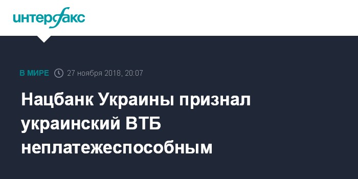 Москва. 27 ноября. INTERFAX.RU - Национальный банк Украины (НБУ) отнес АО "ВТБ банк" (Киев) к категории неплатежеспособных, сообщается на сайте центробанка.