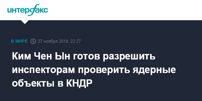 Москва. 27 ноября. INTERFAX.RU - Северокорейский лидер Ким Чен Ын выразил готовность разрешить международным инспекторам приехать в КНДР, чтобы провести проверку ядерных объектов, сообщает во вторник агентство "Ренхап" со ссылкой на высокопоставленный дипломатический источник.