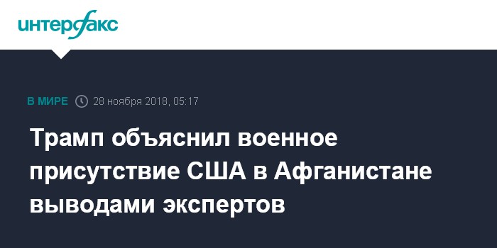 Москва. 28 ноября. INTERFAX.RU - Президент США Дональд Трамп заявил, что намерен сохранять военное присутствие США в Афганистане по совету экспертов.