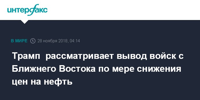 Москва. 28 ноября. INTERFAX.RU - Президент США Дональд Трамп заявил, что рассматривает возможность вывода американских войск с Ближнего Востока по мере снижения цен на нефть.