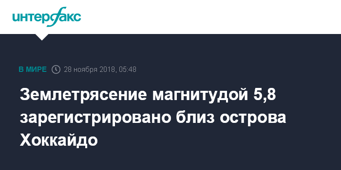 Москва. 28 ноября. INTERFAX.RU - Землетрясение магнитудой 5,8 зафиксировано в акватории Тихого океана у южного побережья острова Хоккайдо (Япония), сообщает Алтае-Саянский филиал Единой Геофизической службы РАН.