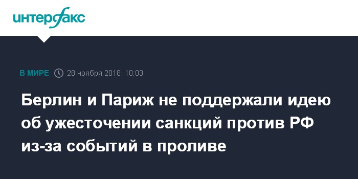 Москва. 28 ноября. INTERFAX.RU - Германия и Франция не поддерживают предложение о расширении санкций в отношении России в связи с недавними событиями в районе Керченского пролива, сообщает в среду газета Die Welt.