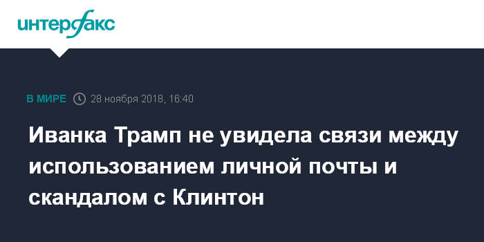 Москва. 28 ноября. INTERFAX.RU - Советник и дочь президента США Дональда Трампа Иванка не считает, что существует какая-то связь между ситуацией с ее личной почтой и скандалом вокруг переписки экс-кандидата в президенты США Хиллари Клинтон, сообщает телеканал ABC News со ссылкой на заявление Иванки.