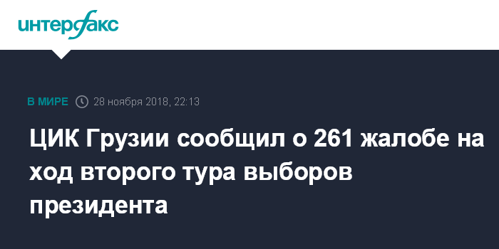 Москва. 28 ноября. INTERFAX.RU - Центральная избирательная комиссия Грузии сообщает, что в окружные комиссии поступила 261 жалоба в ходе прошедшего в среду второго тура президентских выборов.