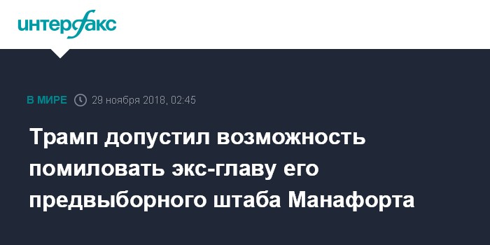 Москва. 29 ноября. INTERFAX.RU - Президент США Дональд Трамп заявил, что вопрос о помиловании экс-главы его предвыборного штаба Пола Манафорта не снят с повестки дня.