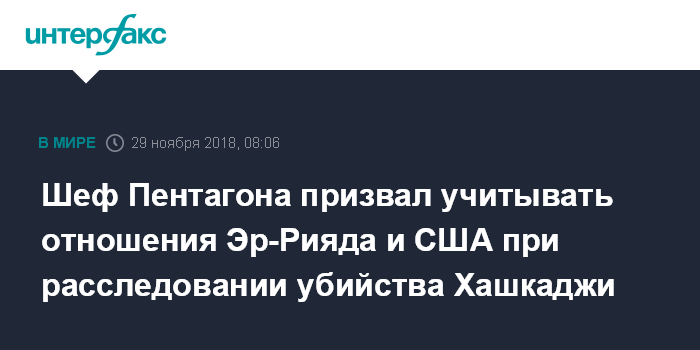 Москва. 29 ноября. INTERFAX.RU - Саудовская Аравия играет важную роль в обеспечении безопасности США и на Ближнем Востоке, это необходимо учитывать при определении ответственности властей королевства за убийство в Стамбуле саудовского журналиста Джамаля Хашкаджи, заявил министр обороны США Джим Мэттис.