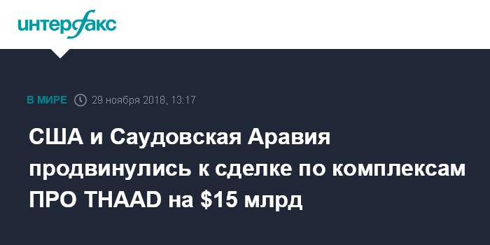 Москва. 29 ноября. INTERFAX.RU - США и Саудовская Аравия подписали предварительное межправительственное соглашение о поставке Эр-Рияду американских комплексов противоракетной обороны THAAD на общую сумму $15 млрд. Об этом сообщил телеканал CNBC со ссылкой на представителя госдепартамента.