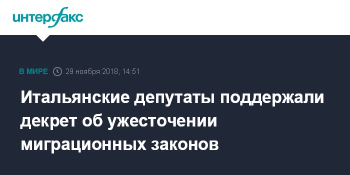 Ранее в ноябре итальянский Сенат поддержал этот закон. Согласно распоряжению Сальвини предоставление вида на жительство по гуманитарным причинам будет резко ограничено.