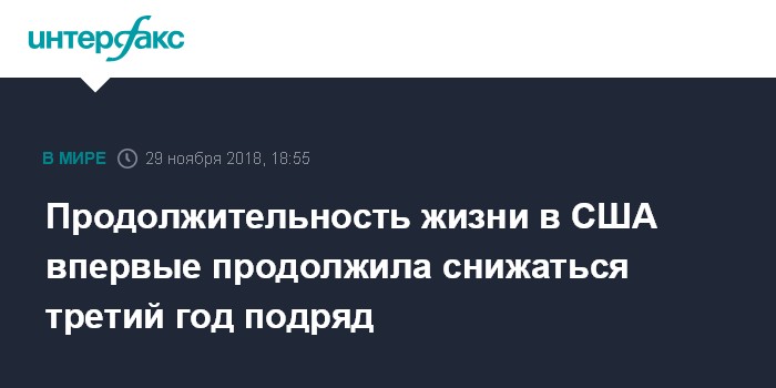 Москва. 29 ноября. INTERFAX.RU - Средняя ожидаемая при рождении продолжительность жизни в США снизилась третий год подряд впервые с 1915-1918 гг., когда на результаты повлияли Первая мировая война и пандемия испанского гриппа, свидетельствует ежегодный доклад Национального центра статистики здравоохранения (NCHS).