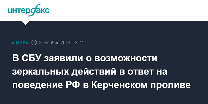 Москва. 30 ноября. INTERFAX.RU - На Украине принимаются решения о возможности зеркальных действий в ответ "на агрессию РФ" в Керченском проливе, заявили в Службе безопасности страны.