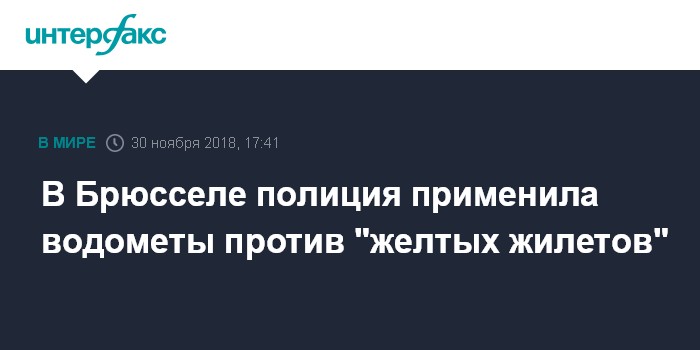 Москва. 30 ноября. INTERFAX.RU - Полиция в Брюсселе применила водометы против вышедших на улицу представителей бельгийского движения "желтых жилетов", сообщает в пятницу телеканал BFM TV.