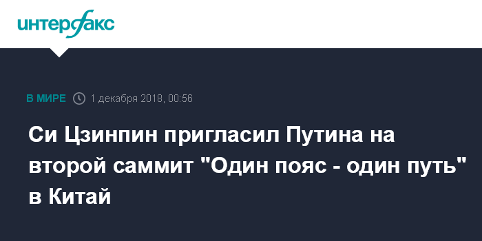 Москва. 1 декабря. INTERFAX.RU - Лидер КНР Си Цзиньпин пригласил президента России Владимира Путина принять участие Вас во втором саммите "Один пояс - один путь" в конце апреля 2019 года.