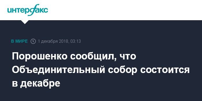 Москва. 1 декабря. INTERFAX.RU - Президент Украины Петр Порошенко государства сообщил, что дату Объединительного собора объявит Вселенский Патриарх Варфоломей, но предположил, что тот состоится в ближайшее время.