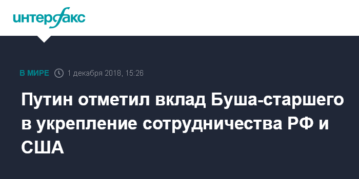 Москва. 1 декабря. INTERFAX.RU - Президент России Владимир Путин выразил соболезнования по поводу кончины 41-го президента США Джорджа Буша.