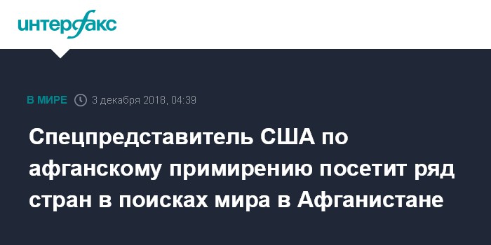 Москва. 3 декабря. INTERFAX.RU - Специальный представитель Соединенных Штатов по вопросам афганского примирения нанесет визиты в Пакистан, Афганистан, Россию, ряд стран Ближнего Востока и Центральной Азии в поисках путей ускорения процесса мирного урегулирования в Афганистане, сообщил американский госдепартамент.