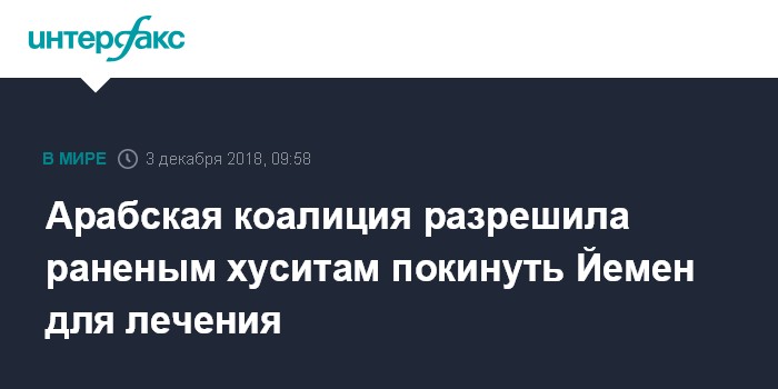 Телеканал отмечает, что речь идет о 50 хуситах, и такой шаг был сделан коалицией после соответствующего запроса спецпосланника ООН по Йемену Мартина Гриффитса. Выезд раненых хуситов для прохождения лечения является ключевым требованием мятежников для того, чтобы они приняли участие на переговорах в Швеции.