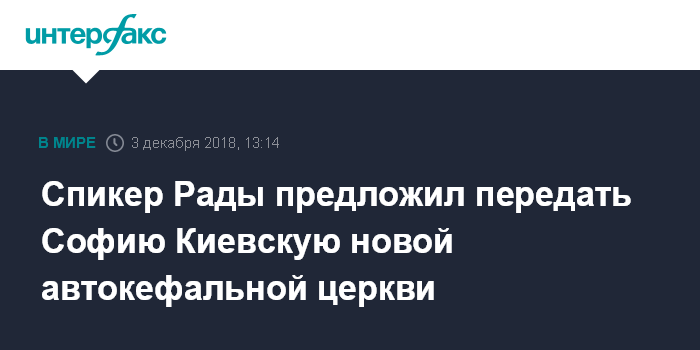 Москва. 3 декабря. INTERFAX.RU - Спикер Верховной рады Андрей Парубий предлагает использовать киевский собор Святой Софии для богослужений создаваемой "единой поместной церкви" Украины.