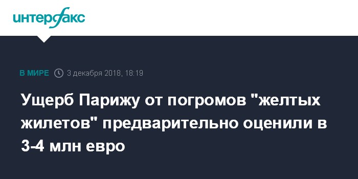 Москва. 3 декабря. INTERFAX.RU - Ущерб в размере 3-4 млн евро нанесен Парижу в результате акций протеста "желтых жилетов" в минувшие выходные - таковы первые оценочные данные парижской мэрии, которые приводит в понедельник французская радиостанция РТЛ.