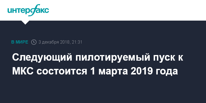 Москва. 3 декабря. INTERFAX.RU - Следующий пилотируемый запуск к МКС состоится 1 марта, сообщил глава госкорпорации "Роскосмос" Дмитрий Рогозин.