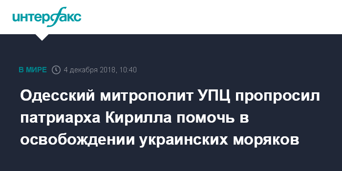 Москва. 4 декабря. INTERFAX.RU - Митрополит Одесский и Измаильский Агафангел направил открытое обращение патриарху Московскому и всея Руси Кириллу с просьбой содействовать скорейшему освобождению украинских моряков, которые были задержаны в Керченском проливе.