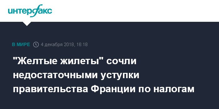 Москва. 4 декабря. INTERFAX.RU - Представители французского движения "желтые жилеты" выразили неудовлетворение новыми мерами правительства страны, в частности введением моратория на рост цен на топливо, сообщают во вторник парижские СМИ.