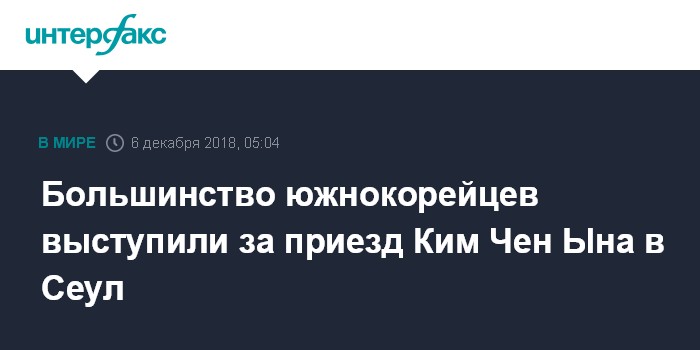 Москва. 6 декабря. INTERFAX.RU - Более 60% жителей Южной Кореи приветствуют возможный визит северокорейского лидера Ким Чен Ына в Сеул, следует из результатов опроса общественного мнения, проведенного центром Realmeter.