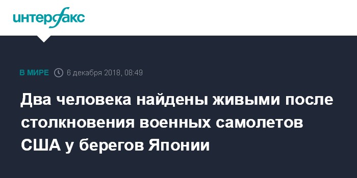 Москва. 6 декабря. INTERFAX.RU - Еще один американский военнослужащий спасен в ходе поисково-спасательной операции возле берегов Японии после столкновения американского истребителя F/A-18 и самолета-заправщика KC-130, сообщает в четверг телеканал NHK.