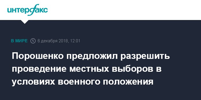 Москва. 6 декабря. INTERFAX.RU - Изменения в закон "О правовом режиме военного положения", предложенные президентом Украины Петром Порошенко, предполагают отменить запрет на проведение местных выборов, назначенных на 23 декабря 2018 года, в условиях военного положения.