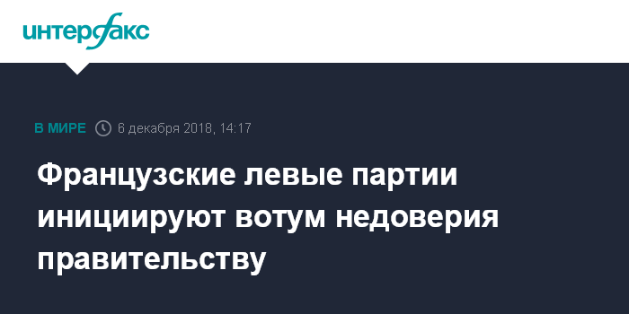 Москва. 6 декабря. INTERFAX.RU - Ряд французских партий левого толка договорились обсудить вопрос о возможности вынесения в парламенте вотума недоверия правительству страны, сообщает в четверг телеканал BFM TV со ссылкой на собственные источники.