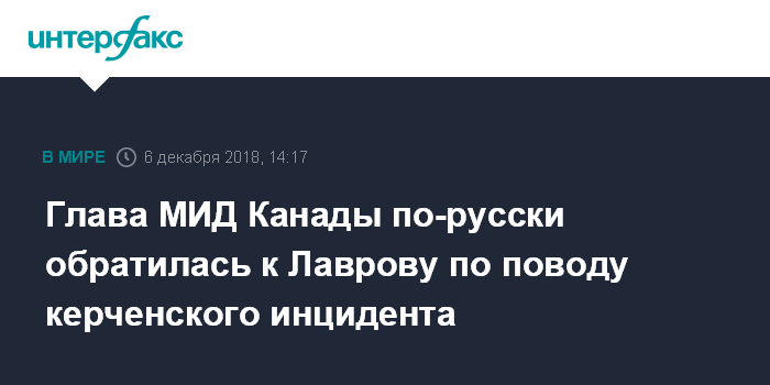 Москва. 6 декабря. INTERFAX.RU - Министр иностранных дел Канады Христя Фриланд подвергла в четверг критике инцидент в Керченском проливе, обратившись при этом к главе МИД РФ Сергею Лаврову на русском языке.