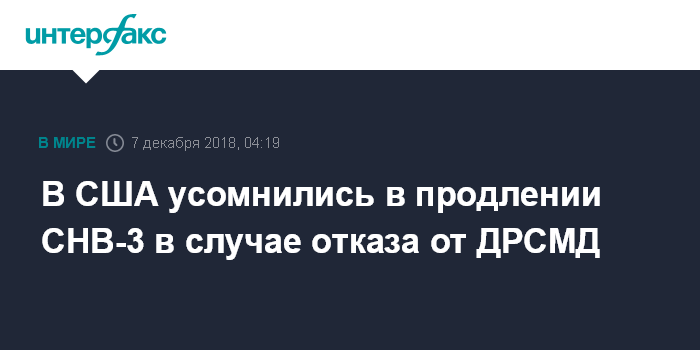 Москва. 7 декабря. INTERFAX.RU - Глава объединенного комитета начальников штабов армии США Джозеф Данфорд сомневается в прогрессе при обсуждении с Россией продления Договора о стратегических наступательных вооружениях (СНВ-3), если Договор о ликвидации ракет средней и меньшей дальности (ДРСМД) перестанет действовать.