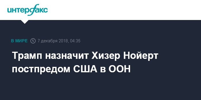 Москва. 7 декабря. INTERFAX.RU - Президент США Дональд Трамп заявит в пятницу о своем решении назначить пресс-секретаря госдепа США Хизер Нойерт постоянным представителем страны в ООН вместо Никки Хейли, сообщает телеканал Fox News.