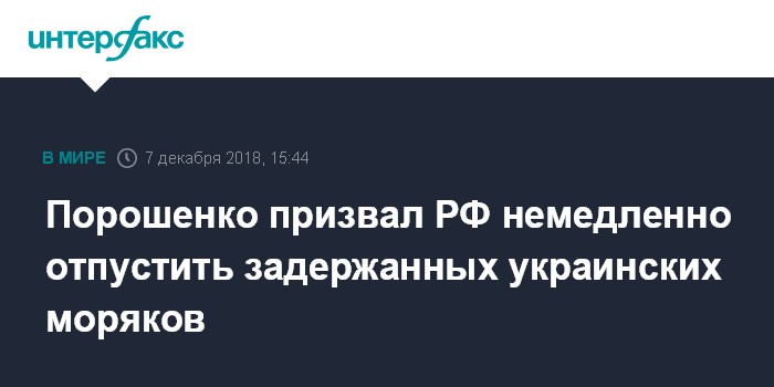 Москва. 7 декабря. INTERFAX.RU - Президент Украины Петр Порошенко потребовал освобождения военных моряков, задержанных российскими пограничниками в Керченском проливе 25 ноября.