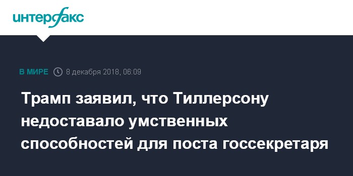 Москва. 8 декабря. INTERFAX.RU - Президент США Дональд Трамп, реагируя на критику со стороны бывшего госсекретаря Рекса Тиллерсона, заявил, что тому недоставало умственных способностей для работы.