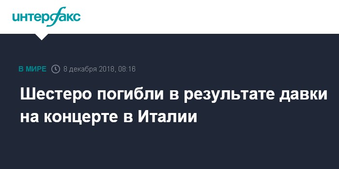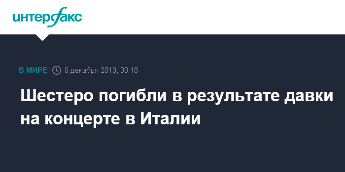 "Погибли пятеро подростков - два юноши и три девушки, а также женщина, пришедшая на концерт с дочерью. Издание утверждает, что всего могли пострадать более ста человек, состояние 12 человек оценивается как крайне тяжелое. Итальянское информационное агентство ANSA тоже сообщает о 12 пострадавших в крайне тяжелом состоянии, но не приводит данных об общем количестве раненых", - говорится в сообщении.