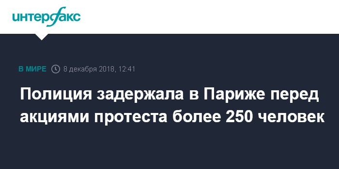 Москва. 8 декабря. INTERFAX.RU - Полиция Франции в преддверии субботних акций протеста "желтых жилетов" задержала в Париже 278 человек, сообщают французские СМИ.
