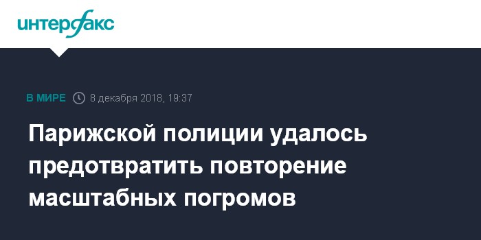 Москва. 8 декабря. INTERFAX.RU - Полиции удалось выдавить из наиболее "критических мест" столицы Франции погромщиков, примкнувших к манифестации "желтых жилетов", сообщают французские СМИ.