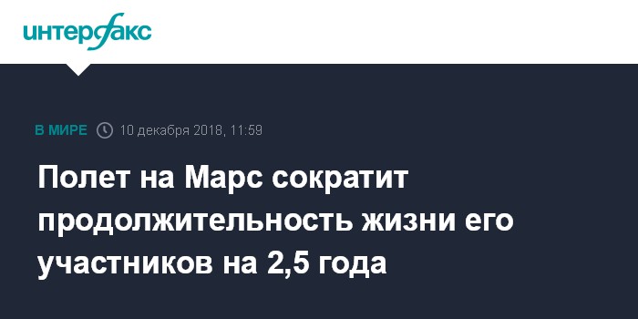 Москва. 10 декабря. INTERFAX.RU - Расчет риска радиационного облучения при полете к Марсу показал, что средняя продолжительность жизни астронавта снизится на 2,5 года, говорится в материалах к конференции по аэрокосмической и экологической медицине.
