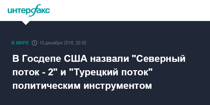 Как отметил Фэннон в ходе телефонного брифинга, "Северный поток -2" является одним из проектов, которые позволят России обойти (при поставках газа - ИФ) Украину и получить прямой доступ к крупнейшим европейским рынкам. По его словам, "проект "Турецкий поток" через Черное море также является политическим инструментом".