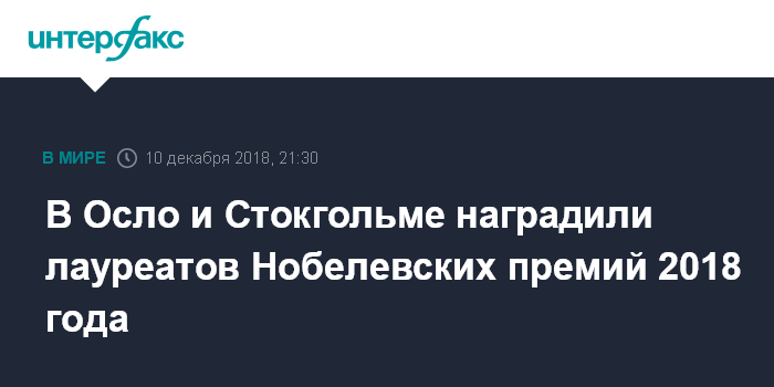 Москва. 10 декабря. INTERFAX.RU - Лауреаты Нобелевских премий 2018 года в понедельник получили награды в ходе торжественных церемоний в Осло и Стокгольме.