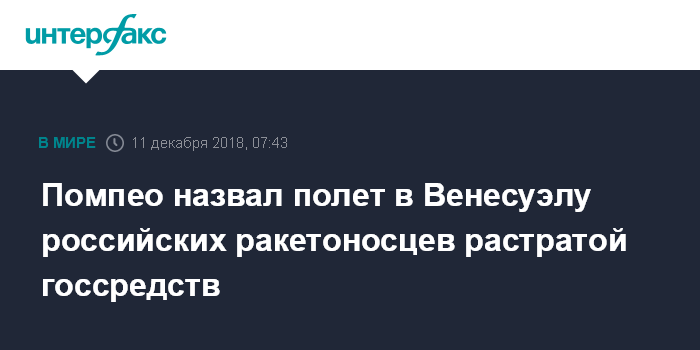 "Российское правительство отправило бомбардировщики через полмира в Венесуэлу. Народам России и Венесуэлы следует рассматривать это так: два коррумпированных правительства растрачивают государственные средства и попирают свободу, в то время как их народы страдают", - написал Помпео в твиттере госдепа США.