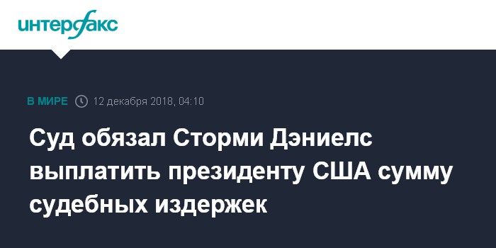 Москва. 12 декабря. INTERFAX.RU - Федеральный судья во вторник обязал порноактрису Стоми Дэниэлс оплатить президенту США Дональду Трампу судебные издержки в $292 тыс. и еще одну тысячу штрафа в связи с ее отклоненным иском о клевете, сообщил телеканал CNBC.