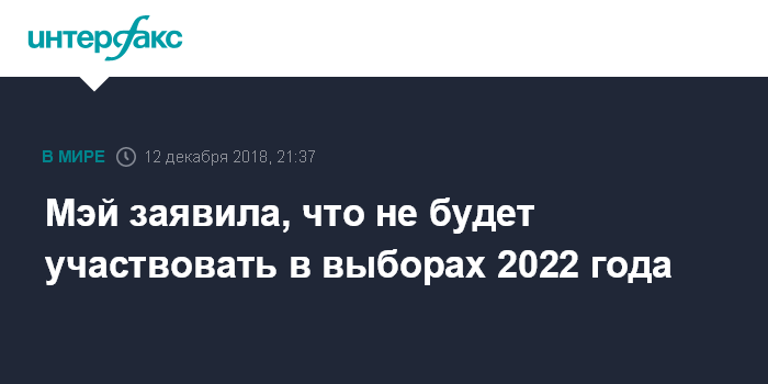 Москва. 12 декабря. INTERFAX.RU - Британский премьер-министр Тереза Мэй в среду заявила, что не намерена возглавлять консерваторов на парламентских выборах 2022 года, передает The Guardian.